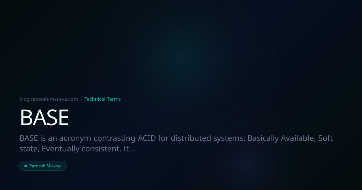 BASE is an acronym contrasting ACID for distributed systems: Basically Available, Soft state, Eventually consistent. It describes a model where availability is prioritized over strict consistency.