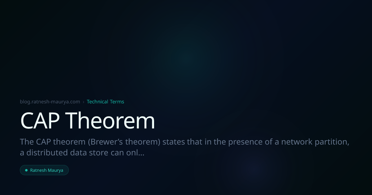 The CAP theorem (Brewer’s theorem) states that in the presence of a network partition, a distributed data store can only guarantee two of the following three: Consistency, Availability, and Partition Tolerance.