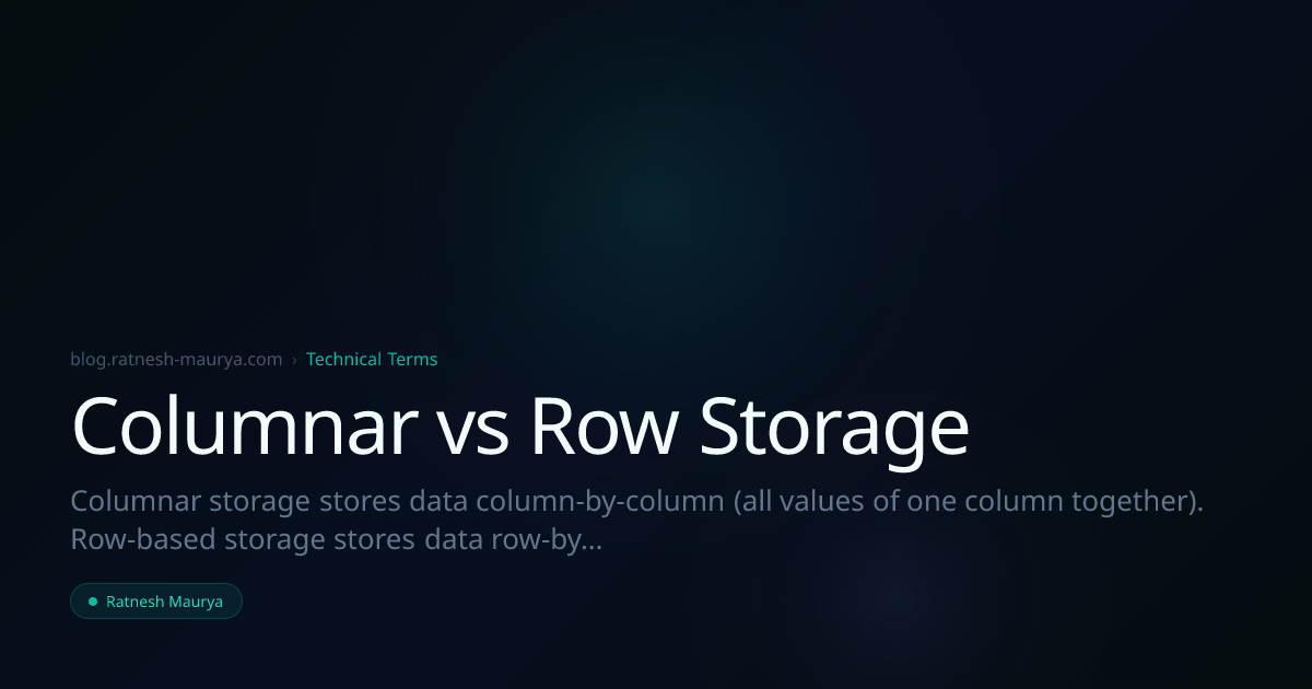 Columnar storage stores data column-by-column (all values of one column together). Row-based storage stores data row-by-row (complete records together).