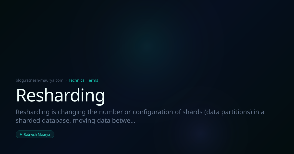 Resharding is changing the number or configuration of shards (data partitions) in a sharded database, moving data between shards accordingly.