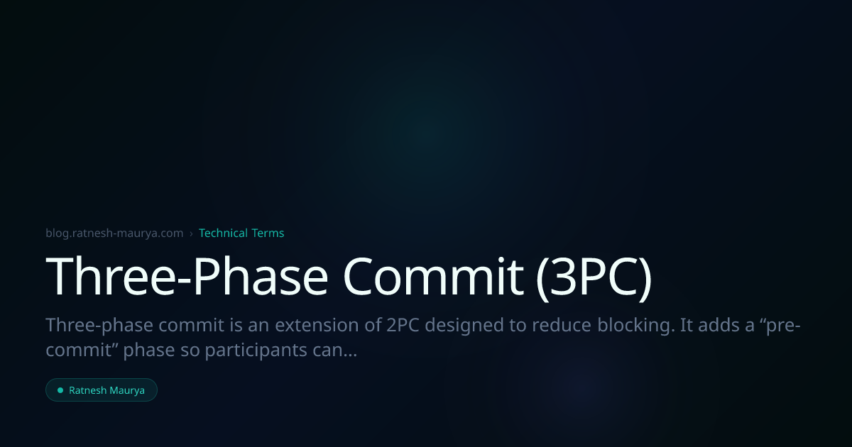 Three-phase commit is an extension of 2PC designed to reduce blocking. It adds a “pre-commit” phase so participants can make a safe decision without indefinite blocking if the coordinator fails[[26]](https://en.wikipedia.org/wiki/Three-phase_commit_protocol "Three-phase commit protocol - Wikipedia").