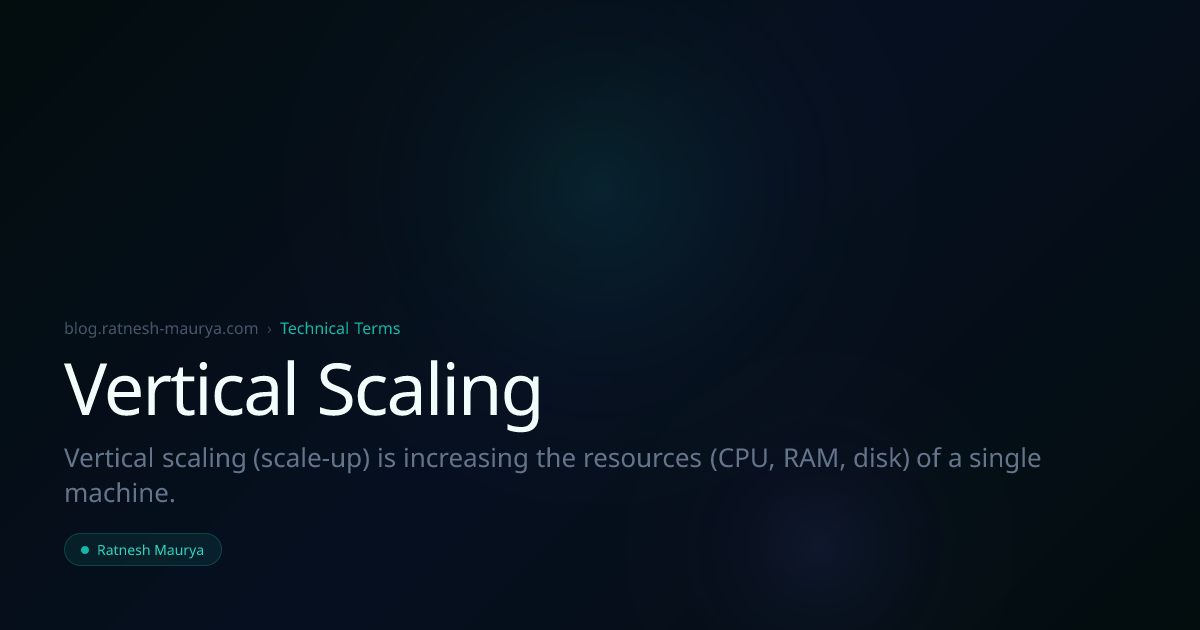 Vertical scaling (scale-up) is increasing the resources (CPU, RAM, disk) of a single machine[[39]](https://www.freecodecamp.org/news/horizontal-vs-vertical-scaling-in-database/ "Horizontal vs. Vertical Scaling – How to Scale a Dat…").